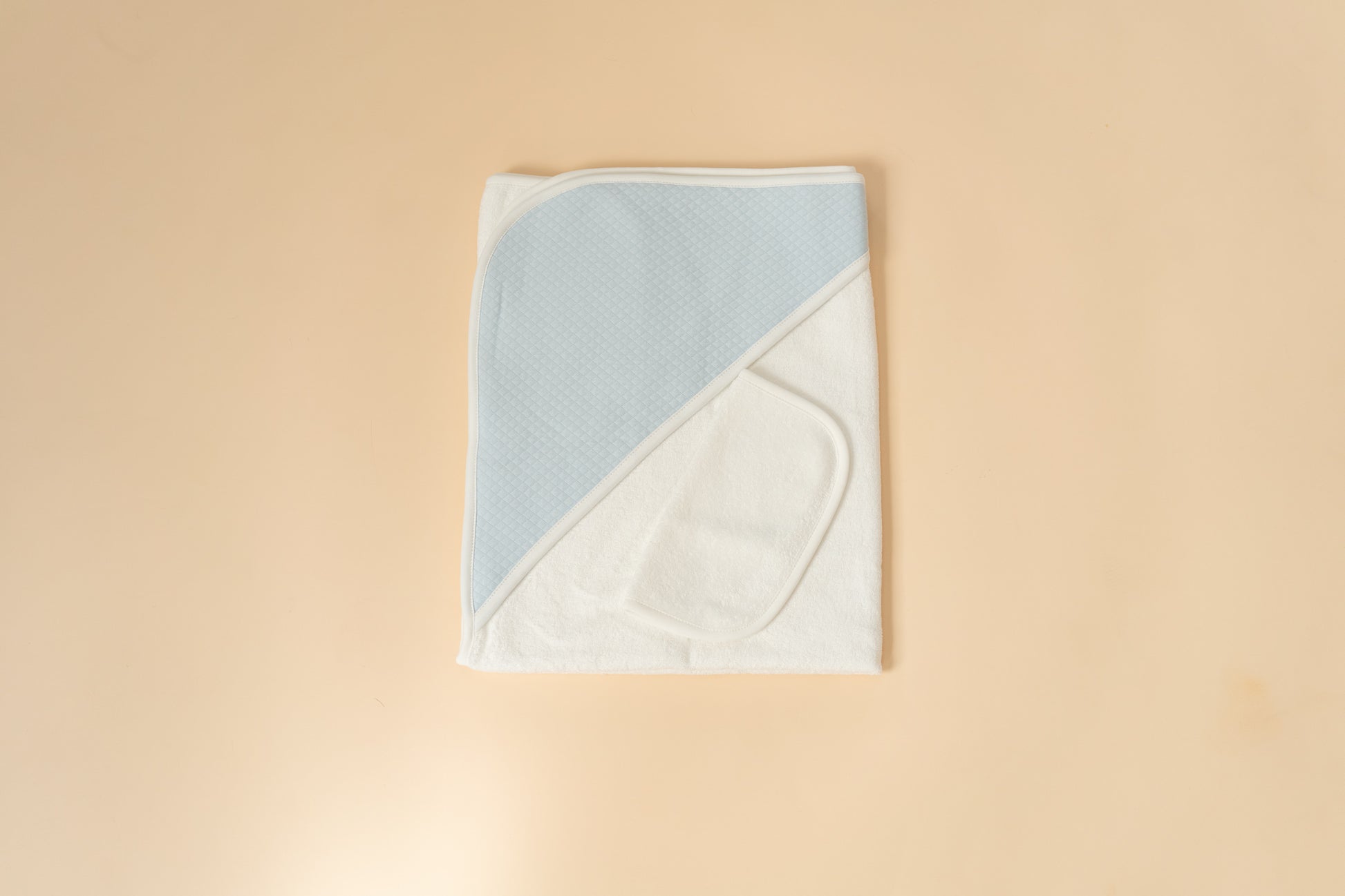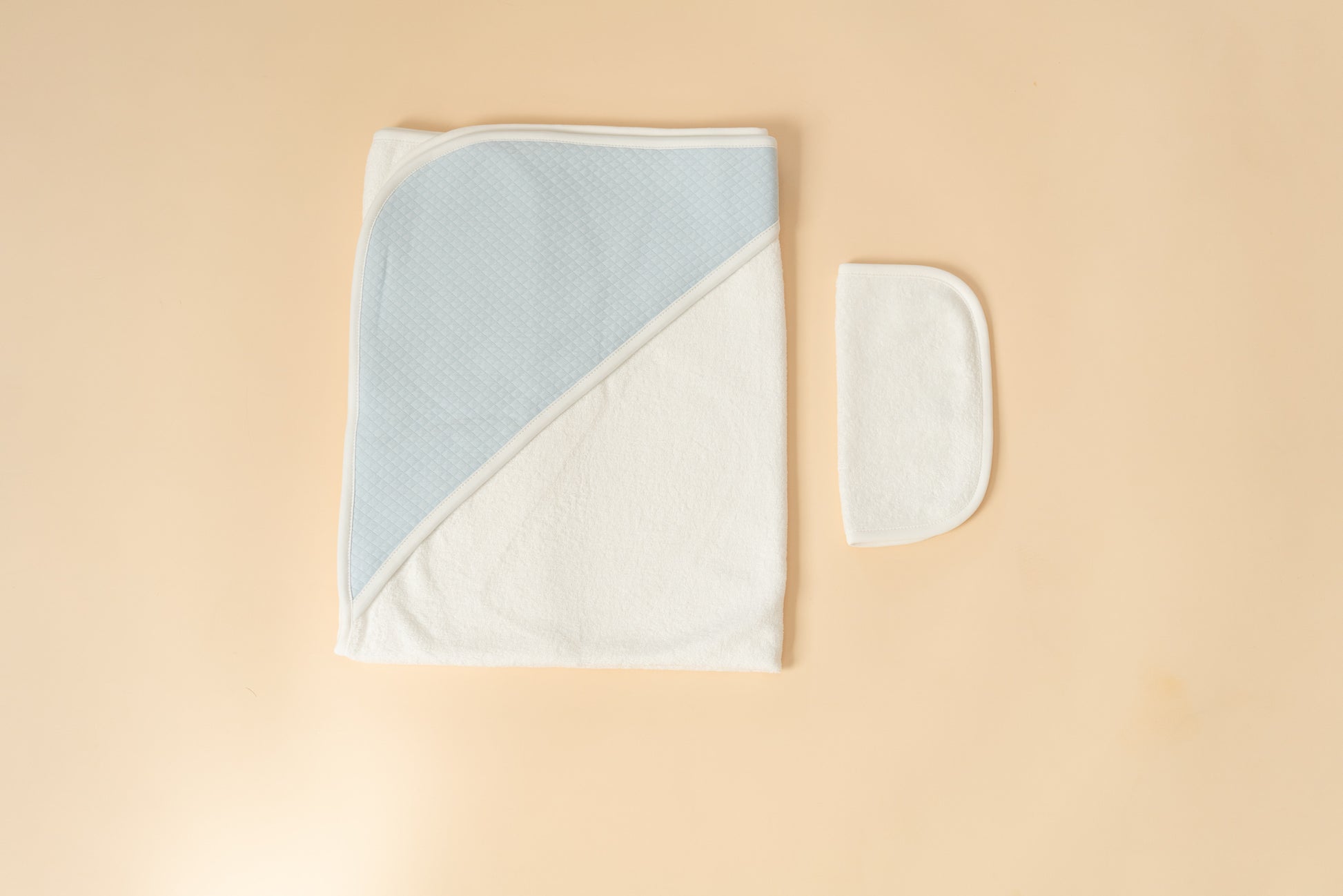 Wrap your little one in comfort with our luxurious Hooded Towel and Matching Wash Cloth set. Crafted from soft, absorbent material, the towel features a charming hooded quilted design adorned with delicate piping trim, ensuring warmth and coziness after every bath time. The serene blue color adds a touch of elegance to your bathroom decor. Accompanied by a coordinating wash cloth, this set is perfect for gentle cleaning and pampering. Ideal for newborns and toddlers, it makes a wonderful gift for baby showers or birthdays.