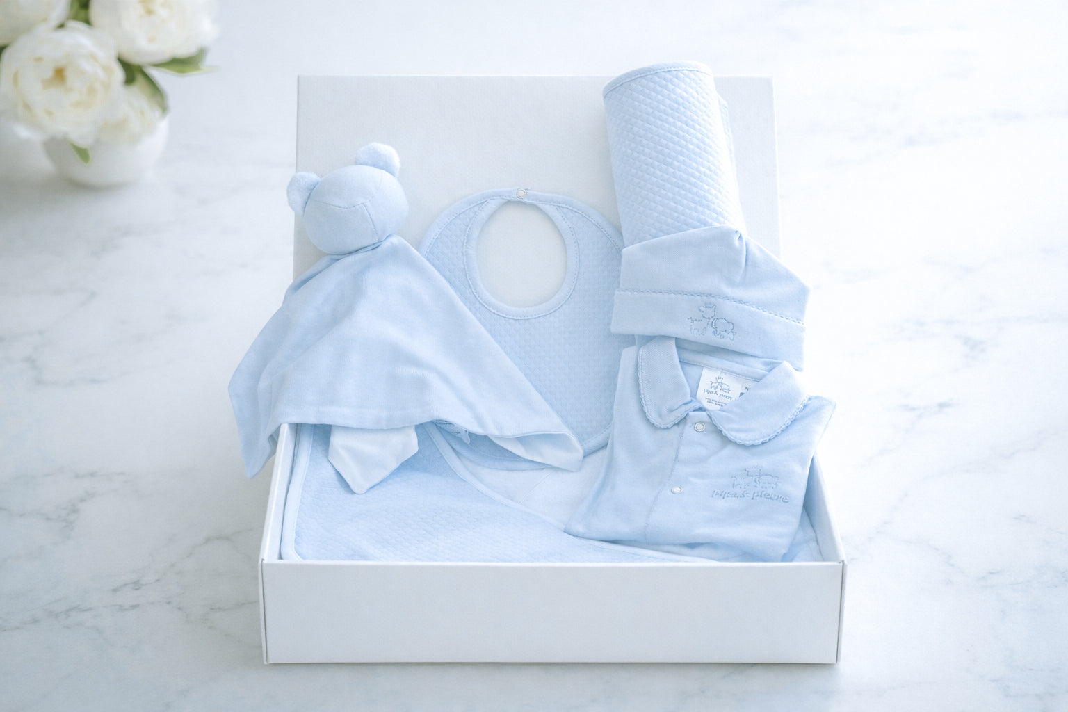 This exquisite gift box is carefully packaged and makes a stunning gift for baby showers or welcoming a new arrival. Treat the little bundle of joy in your life to the ultimate comfort and style!